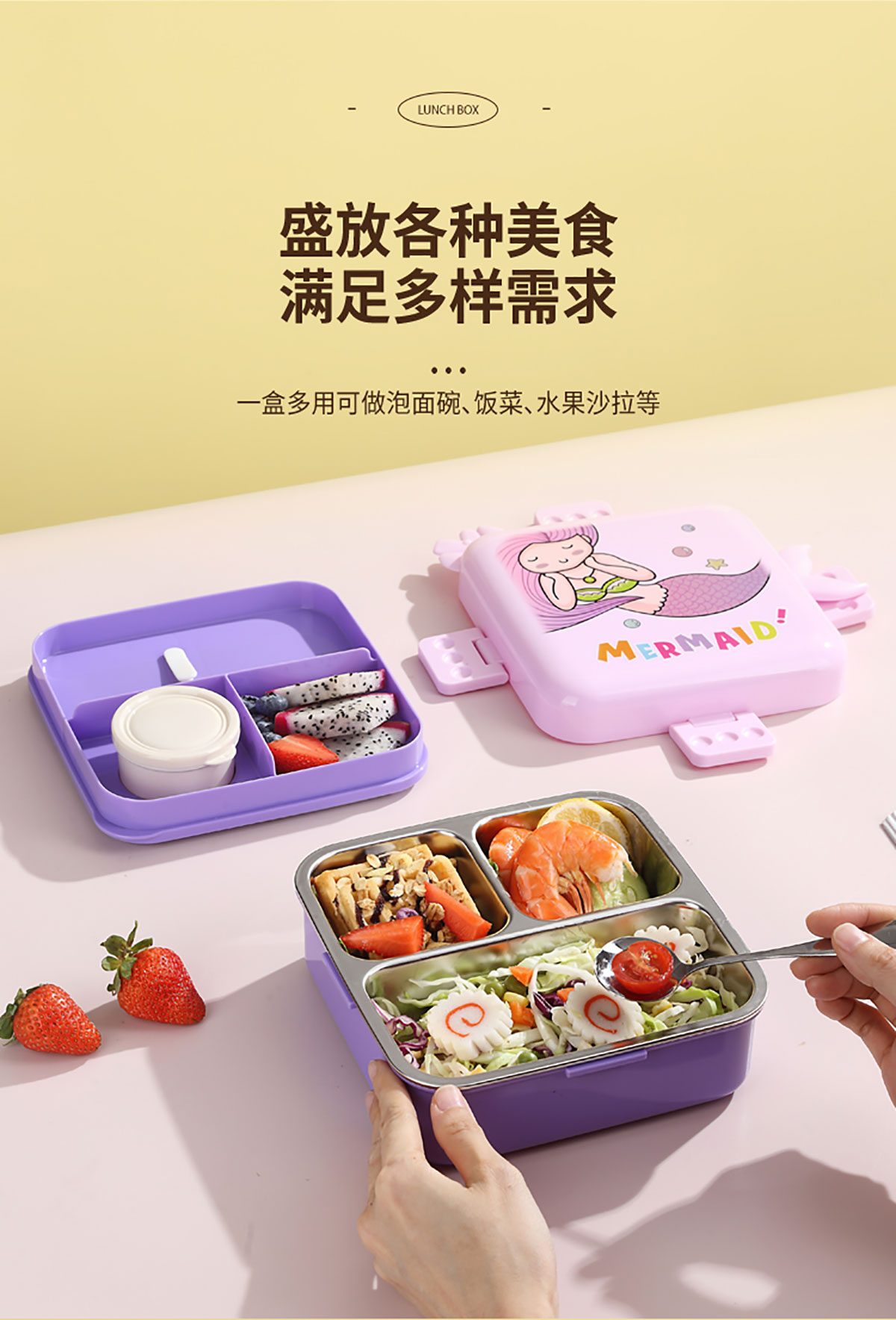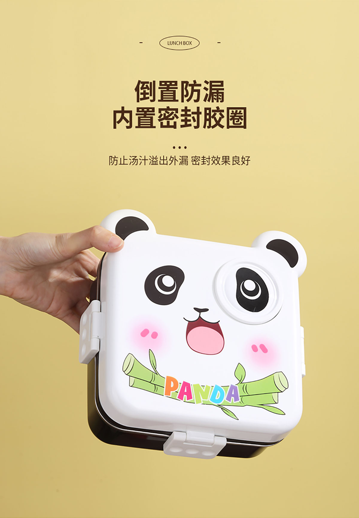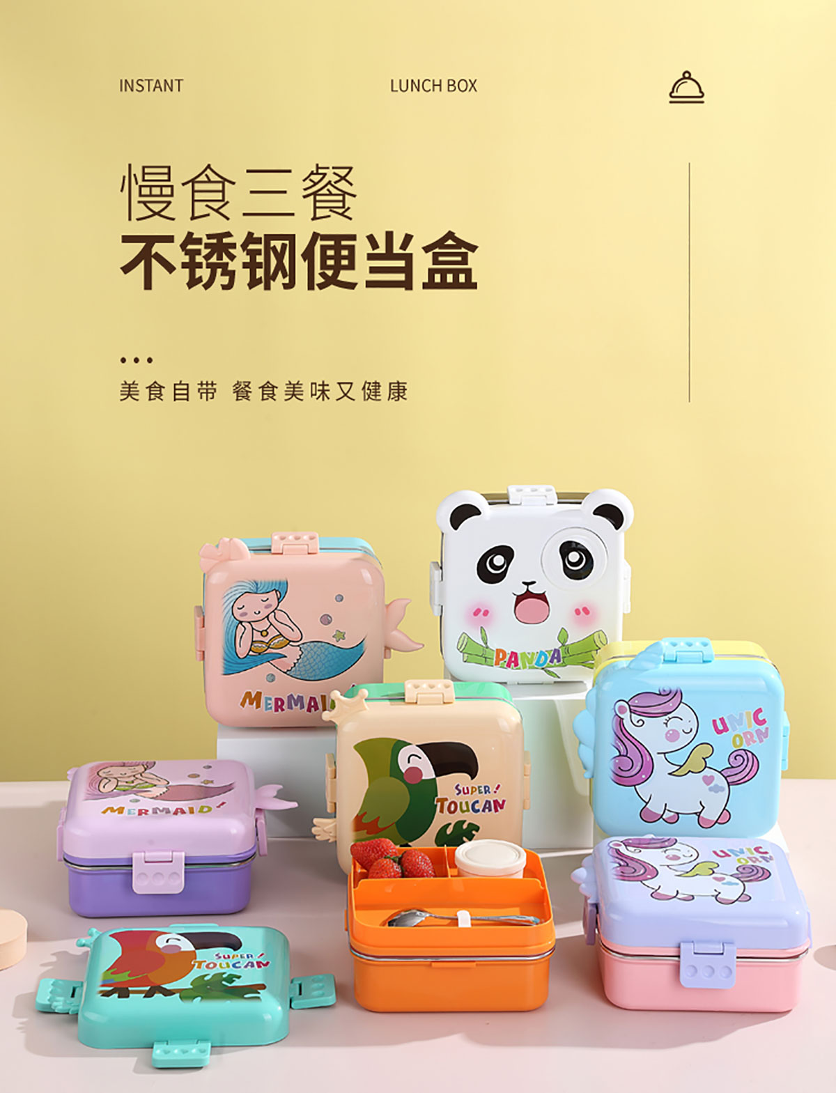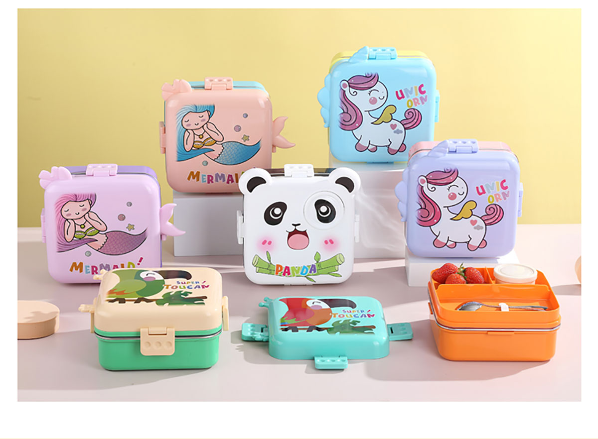 熊貓/大嘴鳥/獨(dú)角獸/美人魚正方形不銹鋼餐盒1120ml+70ml
