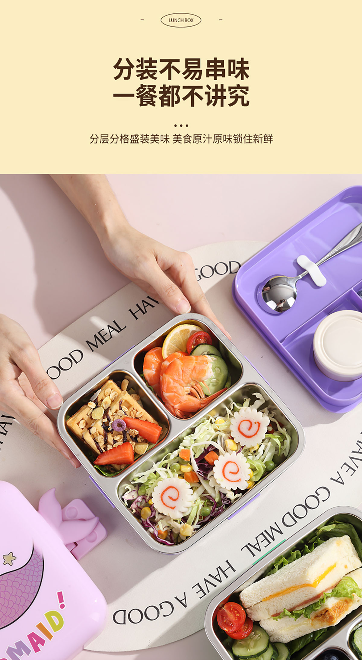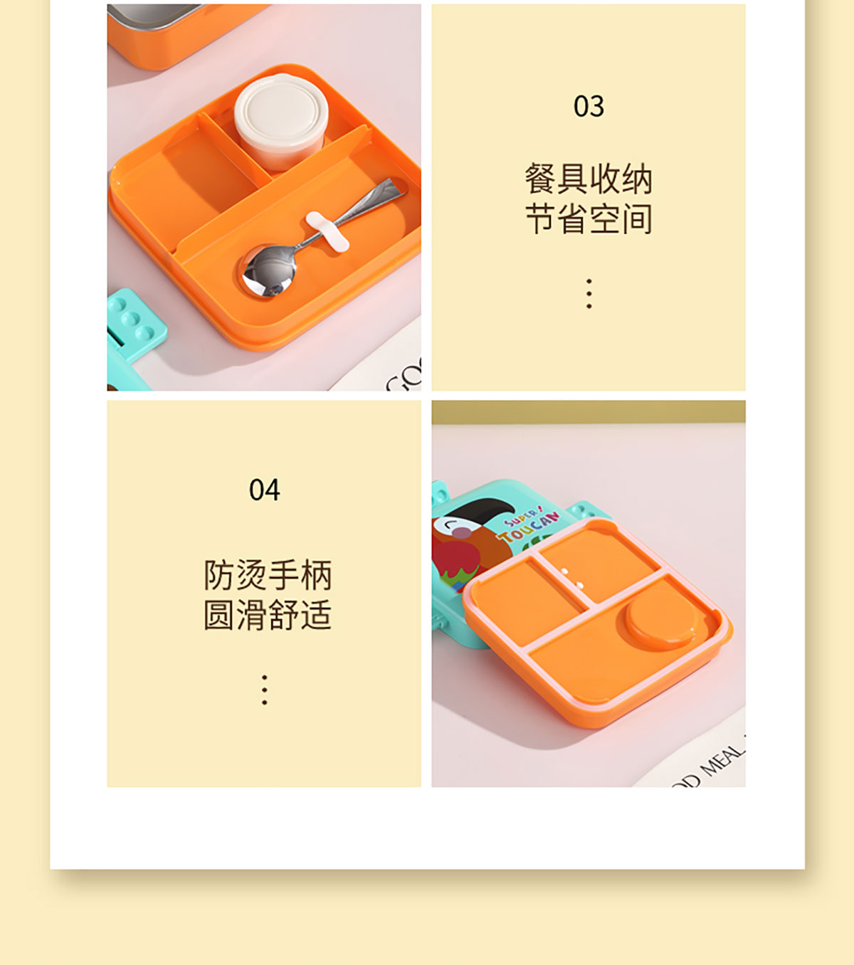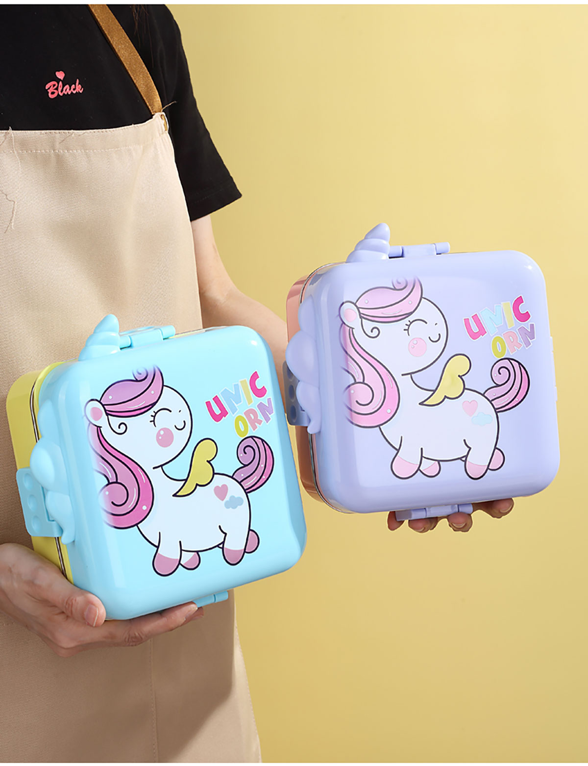 熊貓/大嘴鳥/獨(dú)角獸/美人魚正方形不銹鋼餐盒1120ml+70ml