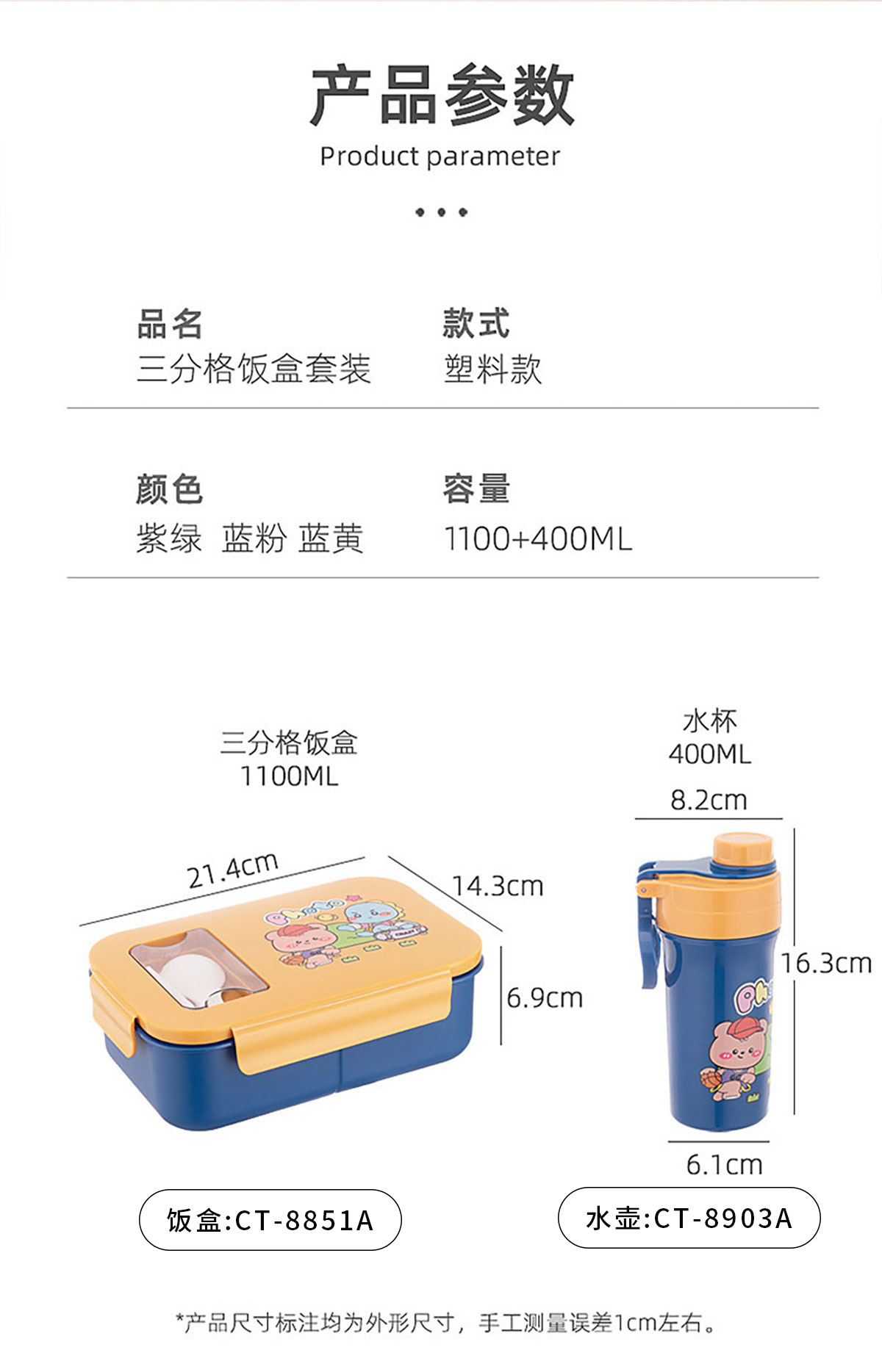 Size: CT-8851A(飯盒):214*143*69mm CT-8903A(水壺):φ82*163mm
